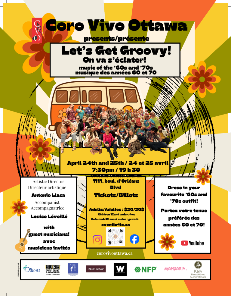 The music from the 60s and 70s was epic and transformative, both in it’s creation but also in the reaction from fans. Music that asks you to be in touch with your inner self and to just feel; being Groovy or feeling that Disco Beat …. CVO wants you to get your GROOVE on and join us on Friday, April 24th and Saturday, April 25th at Orleans United Church, 1111 Orleans Blvd at 7:30pm. Come dressed in your favourite outfit from these fantastic eras of music! Peace Out!